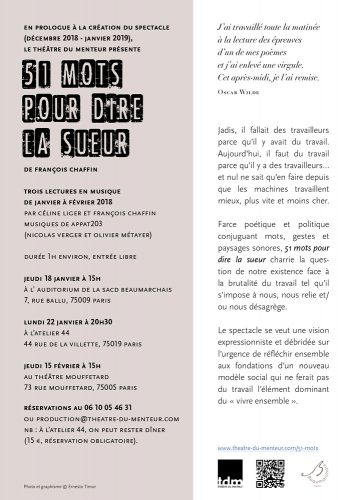 Telle est la première réplique de 51 mots pour dire la sueur de françois chaffin, une farce poético-politique sur ce qui nous relie au travail ; quand il est là, quand il s’en va, que nos bras baissent et que nos yeux n’y trouvent plus demain… à moins que…